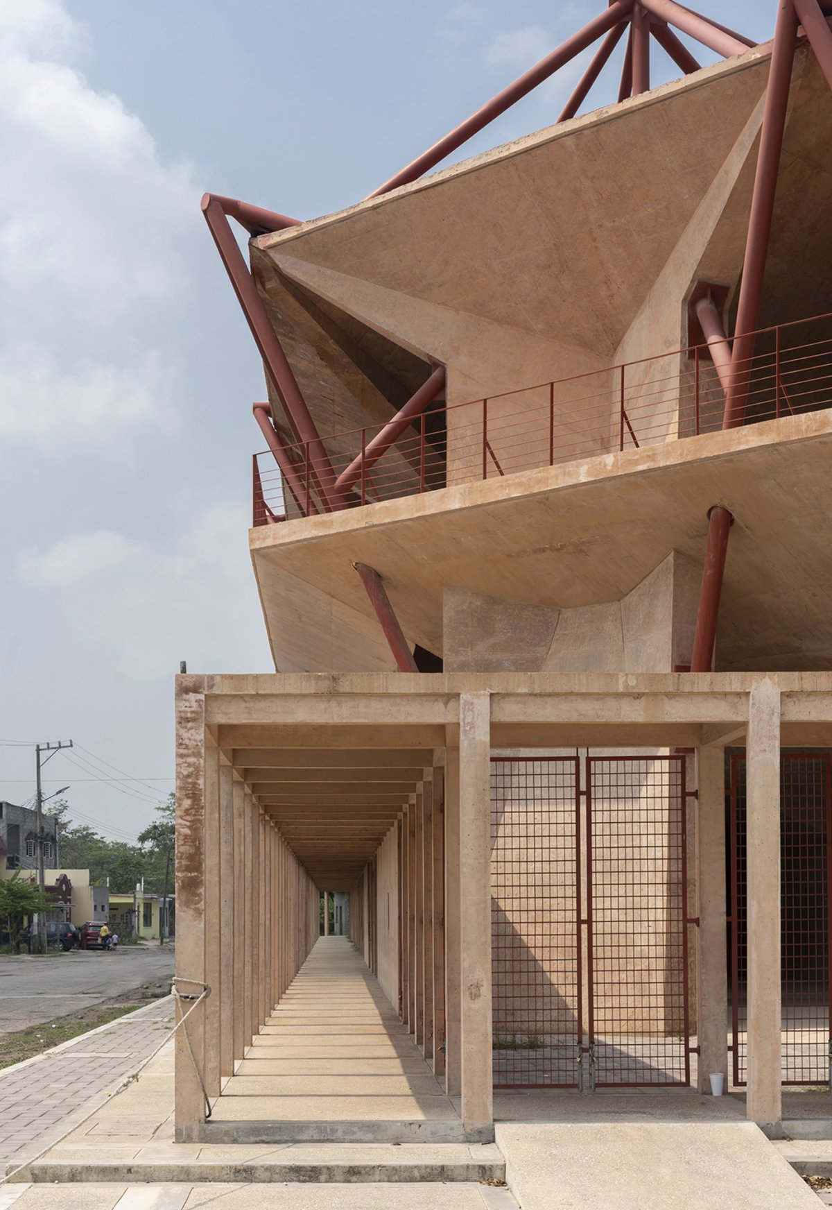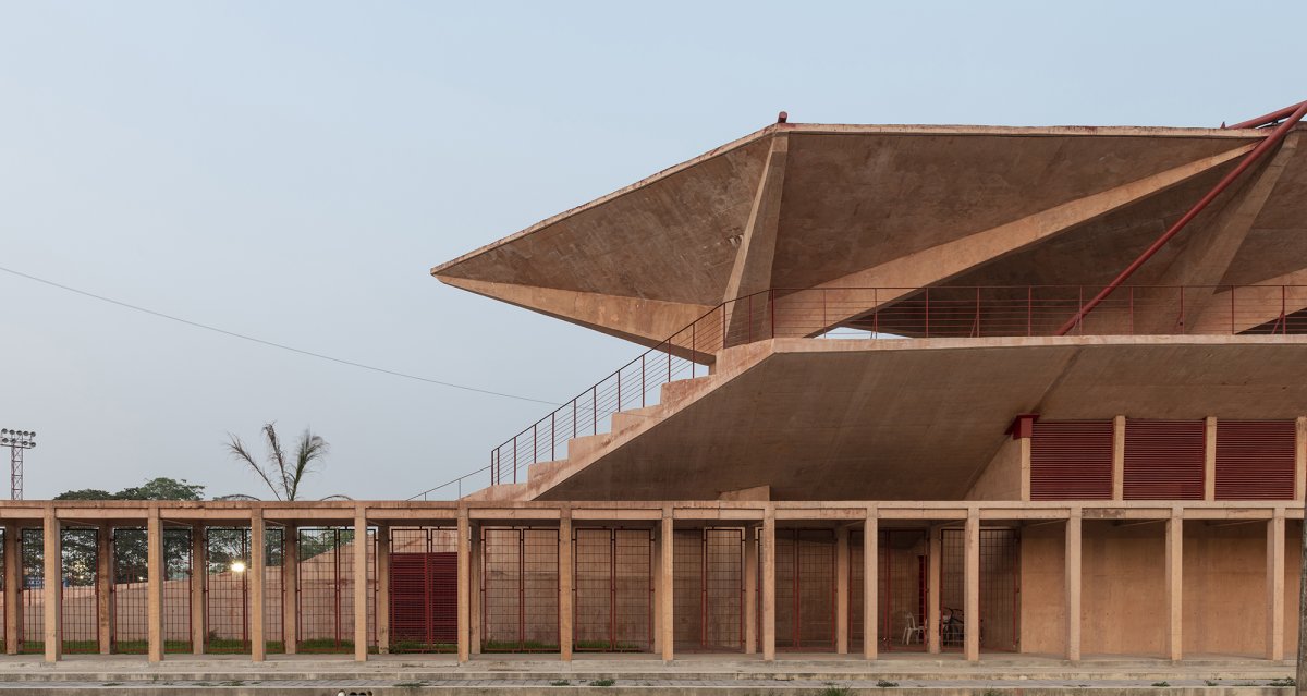 Với Sân vận động Bóng chày Manuel Vargas Izquierdo, nhóm thiết kế áp dụng một ngôn ngữ kiến trúc mạnh mẽ nhưng tối giản. Mười “ô” mái bê tông lộ thiên – những tấm dù khổng lồ – được đỡ bởi hệ dây giằng thép, vừa đảm nhận vai trò che chắn, vừa tạo ấn tượng thị giác mạnh mẽ. Các đường dốc bên hông khán đài giúp đảm bảo tính tiếp cận phổ quát và đồng bộ hóa các phân khu chức năng. Hệ vật liệu chủ đạo là bê tông sắc cam – được nhuộm màu để hòa sắc với chất đá địa phương – góp phần định vị hình ảnh công trình trong bối cảnh bản địa, đồng thời thích ứng tốt với khí hậu nhiệt đới ẩm: phản xạ nhiệt, giảm tích tụ độ ẩm và đảm bảo độ bền.