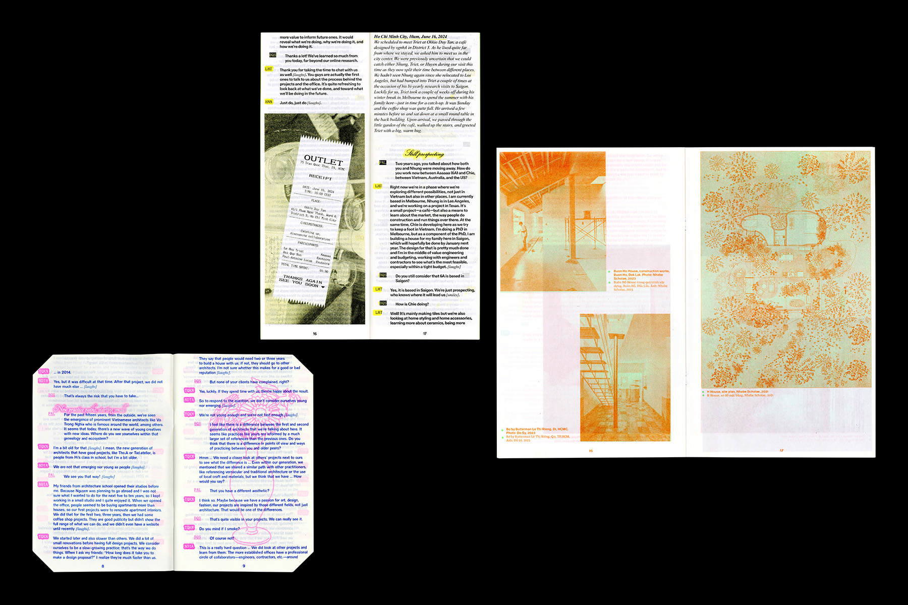 Ở vị thế của người quan sát bên ngoài, chúng tôi bắt đầu bằng việc đối thoại sâu với các kiến trúc sư, ghi âm, chuyển ngữ và xuất bản dưới dạng ấn phẩm. Từ đó, dự án phát triển theo một quá trình mở: từ đối thoại đến in ấn, triển lãm, xin tài trợ và đồng thiết kế cùng các cộng tác viên. Chúng tôi tin vào chính quá trình này — nơi kết quả không được định trước.